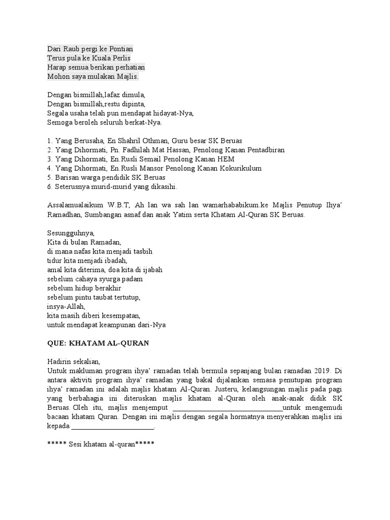 Leave a reply Teks Doa Majlis Perasmian Ihya Ramadhan Panitia Pendidikan Islam Cancel reply. Program pada sesi pagi adalah Majlis Khatam Al-Quran dan Sumbangan Anak Yatim Asnaf. Teks ucapan pengerusi majlis penutup ihya ramadan 2019 teks ucapan pengerusi majlis penutup ihya ramadan calendar teks ucapan pengerusi ma.